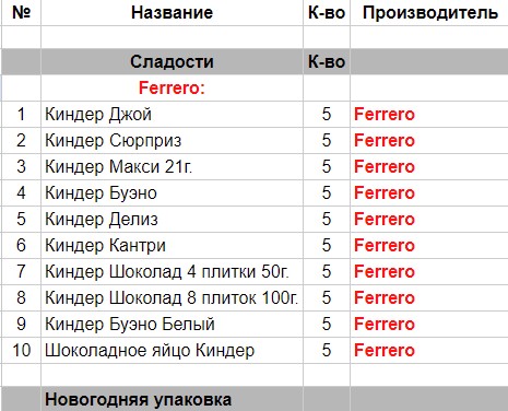 Киндер Джой (5 шт), Киндер Сюрприз (5 шт), Киндер Макси 21 гр (5 шт), Киндер Буено (5 шт), Киндер Делис (5 шт), Киндер Кантри (шт), Киндер Шоколад 4 плитки 50 гр. (5 шт), Киндер Шоколад 8 плиток 100 гр.(5 шт), Киндер Буено Белый (шт), Шоколадное яйцо Киндер (5 шт)